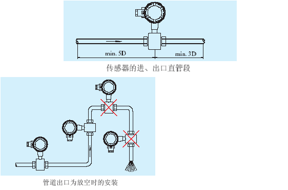 當出口為放空狀態(tài)時,傳感器不應(yīng)安裝在管道放空之處,應(yīng)安裝在較低處。傳感器安裝在管道下方處時,應(yīng)保證傳感器內(nèi)被液體充滿,不能出現(xiàn)空管狀態(tài)。
