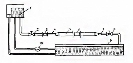 1一溢流水塔;2一截止閥:3一標準流量計( E-mag dN1000);4一DNI000管路;5大管徑試驗管路;6—被檢流量計;7一DN1000管路;8一調節閾;9—蓄水池;10一泵