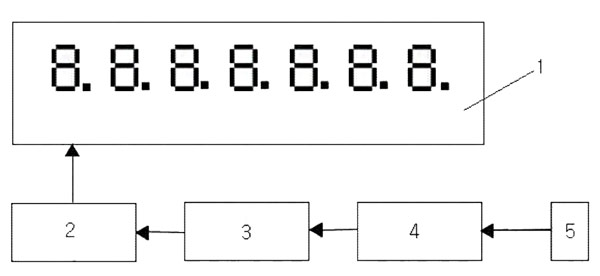 如圖1所示,本實施例所提供的一種用于電磁流量計的遠(yuǎn)距離流量顯裝置,包括LED數(shù)碼管1和LED驅(qū)動芯片2,其特征在于:還包括單片機3、RS485通信芯片4和RS485通信連接件5;